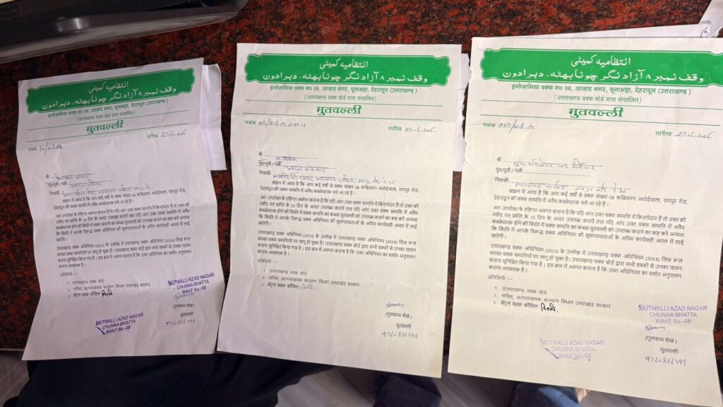 आपको बता दे आज़ाद नगर,चुना भट्टा पर तकरीबन वक़्फ़ की 100 बीघा ज़मीन है जिसपर लोगो द्वारा अवैध रूप से कब्ज़ा कर अपने मकान और प्रतिष्ठान बनाए गए लेकिन अब सरकार इन कब्जों को लेकर सख़्त है आज़ाद नगर,चुना भट्टा पर तकरीबन 250 लोगो को वक़्फ़ की तरफ से नोटिस दिए जाने है जिसके प्रथम चरण में 50 लोगो को वक़्फ़ बोर्ड के मुतावलली के द्वारा नोटिस दिए गए है इसको लेकर उत्तराखंड वक़्फ़ बोर्ड के अध्यक्ष शादाब शम्स का कहना है कि अवैध रूप से कब्जे पर बैठे लोगो को नोटिस दिए जा रहे है और उनसे वक़्फ़ की किराएदारी के सबूत मांगे जा रहे है अगर किसी के पास ऐसे कोई कागज़ात नहीं है तो उनको वक़्फ़ की संपत्तियों से हटाया जाएगा और ऐसी संपत्तियों पर गरीब मुसलमानों के लिए सरकार के साथ मिलकर प्रोजवेट लाए जाएंगे वहीं स्थानीय लोगो का कहना है कि वो एक लंबे समय से इन संपतियों पर रह रहे है सरकार व वक्फ बोर्ड मिलकर मुस्लिम समुदाय के लोगों को टारगेट कर रहे है इसका पूरा विरोध किया जाएगा और जरूरत पड़ने पर कोर्ट की तरफ रुख किया जाएगा।