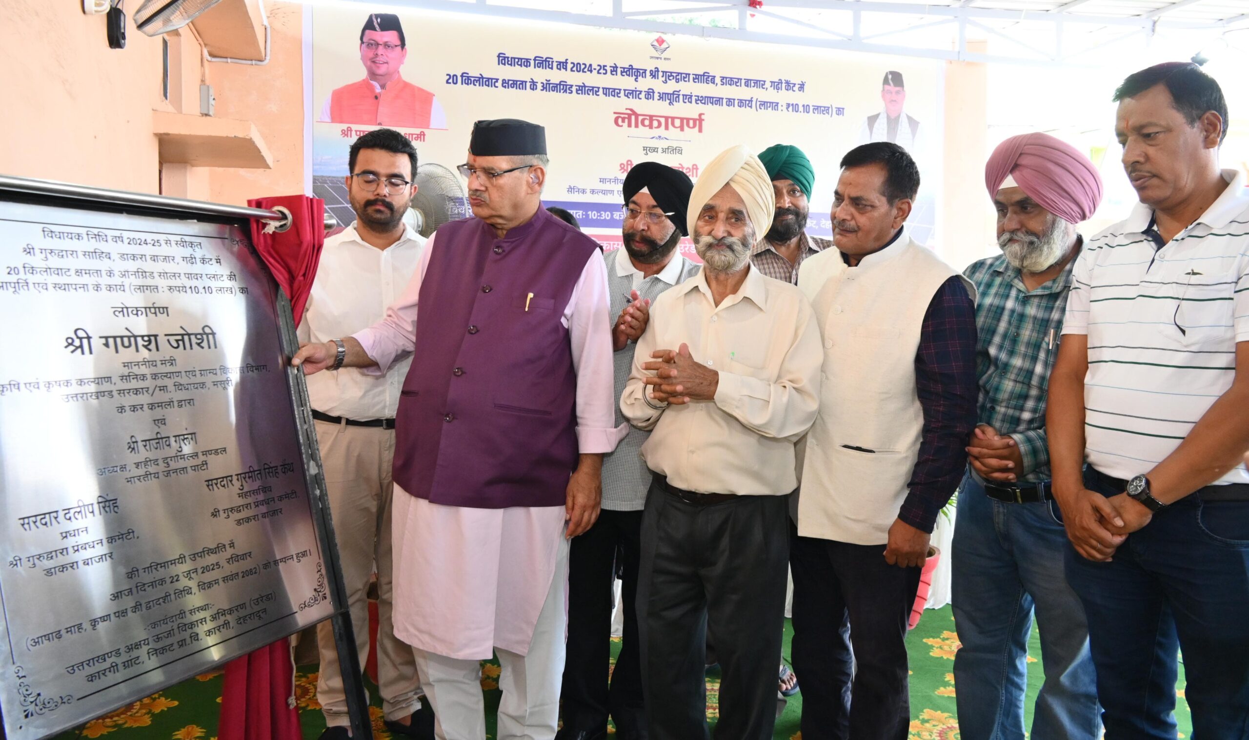 देहरादून के गढ़ी कैंट स्थित डाकरा में प्रदेश के कैबिनेट मंत्री गणेश जोशी ने विधायक निधि से निर्मित हुए 20 किलोवाट सोलर पावर प्लांट का उद्घाटन किया लाभग 10 लाख की लागत से निर्मित यह सोलर प्लांट डाकरा स्थित गुरुद्वारा में स्थापित किया गया है और लगभग 3000 यूनिट प्रतिमाह बिजली का उत्पादन इस सयंत्र के माध्यम से होगा।
