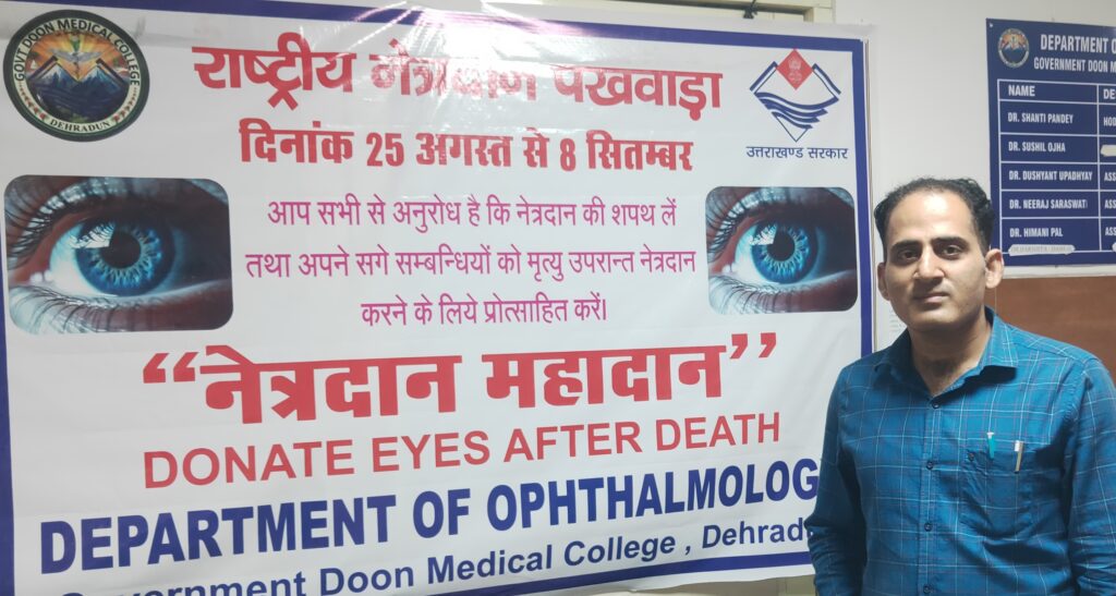 देहरादून आदिल पाशा। नेत्र दान पखवाड़ा: यह प्रतिवर्ष 25 अगस्त से 8 सितम्बर तक मनाया जाता है.इस देशव्यापी मुहिम का मुख्य उद्देश्य आम जन मानस को नेत्रदान के बारे मे जागरूक एवं प्रेरित करना है। राजकीय दून मेडिकल कॉलेज के नेत्र विभाग में असिस्टेंट प्रोफेसर डॉ नीरज सारस्वत लगातार लोगो को नेत्रदान करने के लिए जागरूक कर रहे है पाशा के प्रश्न से बात करते हुए डॉ नीरज ने बताया कि यह बेहद चिंताजनक है कि दुनिया की लगभग आधी नेत्रहीन आबादी भारत में रहती है दरअसल,भारत में नेत्रहीन लोगों की संख्या लगभग 1.5 करोड़ है इनमें से 68 लाख लोग कॉर्नियल ब्लाइंडनेस से पीड़ित हैं साथ ही लगभग 10 लाख लोग दोनों आँखों से अंधे हैं जिन्हें गंभीर दृष्टि दोष है और ये लोग कॉर्निया प्रत्यारोपण से लाभान्वित हो सकते हैं, जिसमें शल्य चिकित्सा द्वारा कॉर्निया का प्रतिस्थापन शामिल है।