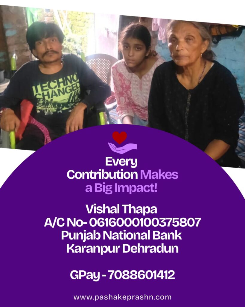 रूपा देवी बताती है कि जब वो ठीक थी तो घरों में झाड़ू बर्तन का काम करके बच्चों को पाल रही थी लेकिन अब उम्र के साथ साथ बीमारी भी हो गई है तो काम नहीं हो पाता ऐसे में परिवार को पालने उनके लिए किसी चुनौती से कम नहीं है। नम आंखों से विशाल बताते है कि वो कोई काम नहीं कर पाते और नानी बीमार रहती है ऐसे में छोटी बहन भी साथ है ऐसे में घर में खाने पीने की भी दिक्कत है लोगो से ज़्यादा से ज़्यादा मदद की आस में लगे हुए है। पाशा के प्रश्न की टीम जब रूपा देवी थापा के घर पहुंची तो वाकई एक टूटा फूटा घर और उस घर में एक मासूम बच्ची के साथ उसका भाई जो अपाहिज है साथ में उसको बूढ़ी नानी उसको भी लोगो से मदद की उम्मीद है। हम आपसे उम्मीद करते है कि रूपा देवी थापा और उसके परिवार की मदद करने के लिए आगे आए।