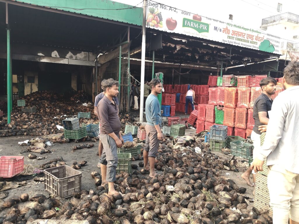 देहरादून। निरंजनपुर फल और सब्जी मंडी में स्थित तीन आढ़तो में दोपहर बाद आग लगने से हड़कंप मच गया वहीं तत्काल पुलिस की सूचबूझ से आग पर काबू पा लिया गया इसके बावजूद भी आढ़तीयो के लाखों के नारियल और दूसरे फ्रूट्स जलकर राख हो गए। सूचना मिलने पर एसपी सिटी देहरादून प्रमोद कुमार भी मौके पर पहुंचे।