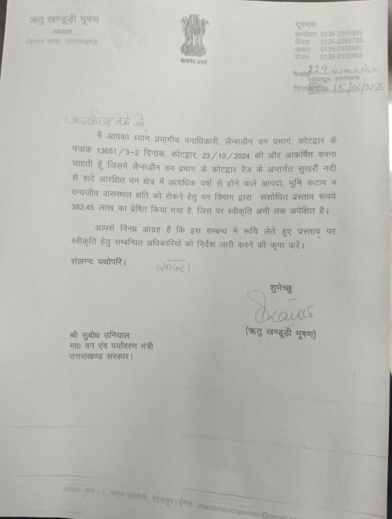 विधानसभा अध्यक्ष ऋतु खंडूरी भूषण ने वन मंत्री से बात करते हुए कहा कि कोटद्वार विधानसभा क्षेत्र राजाजी नेशनल पार्क और कॉर्बेट नेशनल पार्क के मध्य स्थित है और यह क्षेत्र पाँच प्रमुख नदियों सहित अनेक नालों व संवेदनशील पारिस्थितिकी तंत्र का केंद्र है। उन्होंने विशेष रूप से सुखरो नदी से सटे आरक्षित वन क्षेत्र में भारी वर्षा के कारण उत्पन्न होने वाले भूमि कटाव, आपदा जोखिम और वन्य जीवों के वास स्थल को होने वाली क्षति का उल्लेख किया। इन्हीं बिंदुओं के मद्देनज़र, उन्होंने ₹382.45 लाख की लागत से सुरक्षा दीवार निर्माण का प्रस्ताव वन मंत्री के समक्ष रखा।