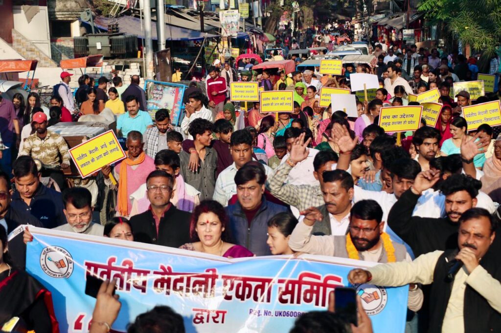 हरिद्वार। उत्तराखंड में पर्वतीय मैदानी एकता समिति का कारवां लगातार बढ़ता जा रहा है मंच की तरफ से रविवार को हरिद्वार में एकता संदेश यात्रा निकाली गई जिसमें लोगो का जनसैलाब उमड़ पड़ा और चारों तरफ़ से पर्वतीय मैदानी एकता समिति के नारों से हरिद्वार गूंज उठा।