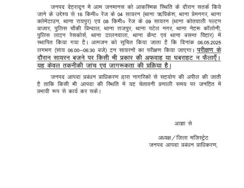 आपको बता दे कि ज़िला देहरादून में 16 किलोमीटर की रेंज के 4 सायरन होंगे जो थाना ऋषिकेश , थाना रायपुर, थाना प्रेमनगर और थाना क्लेमेनटाउन में बजेंगे वही 9 सायरनो की रेंज 8 किलोमीटर की होगी जो थाना कोतवाली पलटन बाजार, पुलिस चौकी बिंदाल, थाना राजपुर, थाना पटेलनगर, थाना नेहरू कॉलोनी, पुलिस लाइन रेस कोर्स, थाना डालनवाला, थाना कैंट व थाना वसंत विहार में बजेंगे। सभी सायरन शाम 6 बजे से 6 बजकर 30 मिनट के बीच बजाए जाएंगे किसी भी जनमानस को इससे पैनिक होने की जरूरत नहीं है किसी भी आपात स्थिति के होने पर इन सायरनो के जरिए लोगों को सतर्क किया जाता है उसी के लिए ये किया जा रहा है।